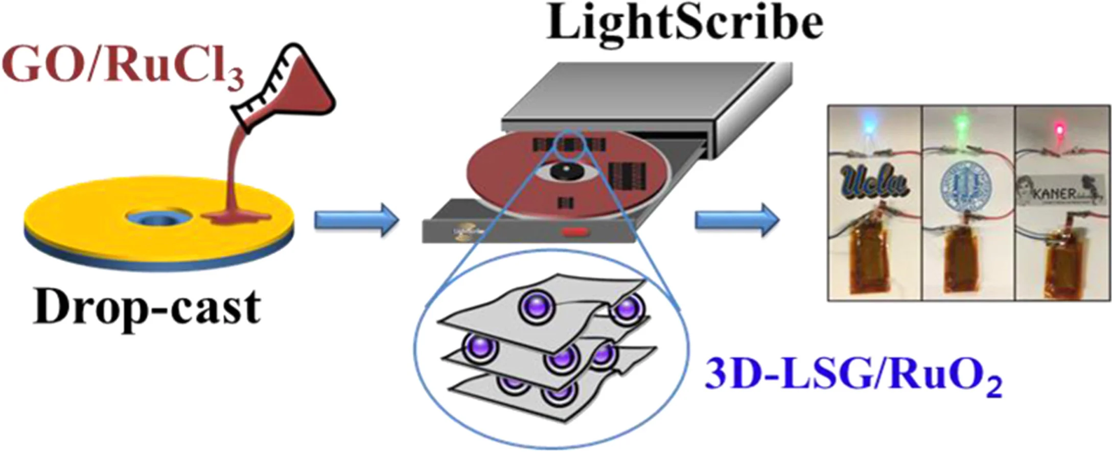 J. Y. Hwang, M. F. El-Kady, Y. Wang, L. Wang, Y. Shao, J. M. Ko, R. B. Kaner. “In-situ One-Step Direct Laser Scribing of Graphene/RuO2 Nanocomposite Electrodes for High-Performance Hybrid Electrochemical Capacitors.” Nano Energy 2015, 18, 57- 70.